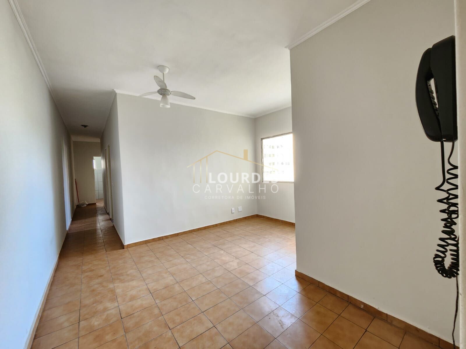 Sala ampla, cozinha e área de serviço.