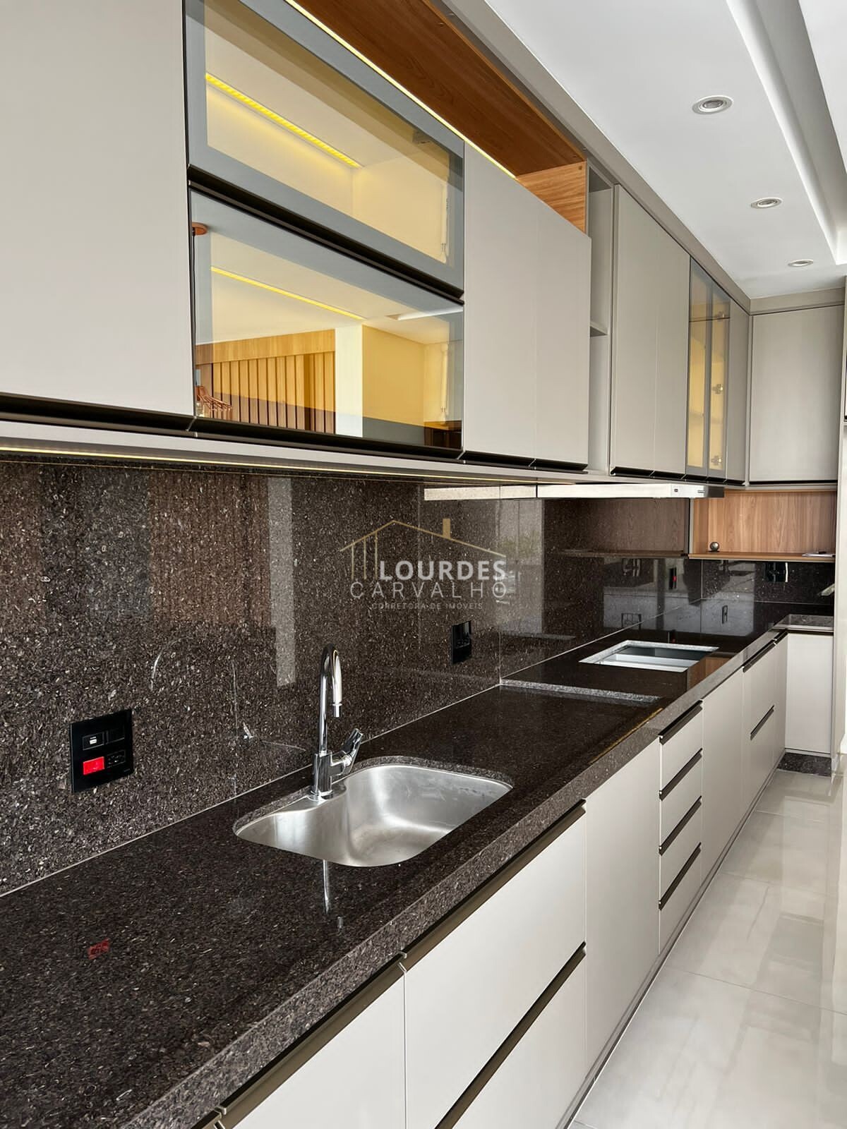 Sala com painel de TV e divisória para a varanda, cozinha, varanda gourmet, lavabo e área de serviço.