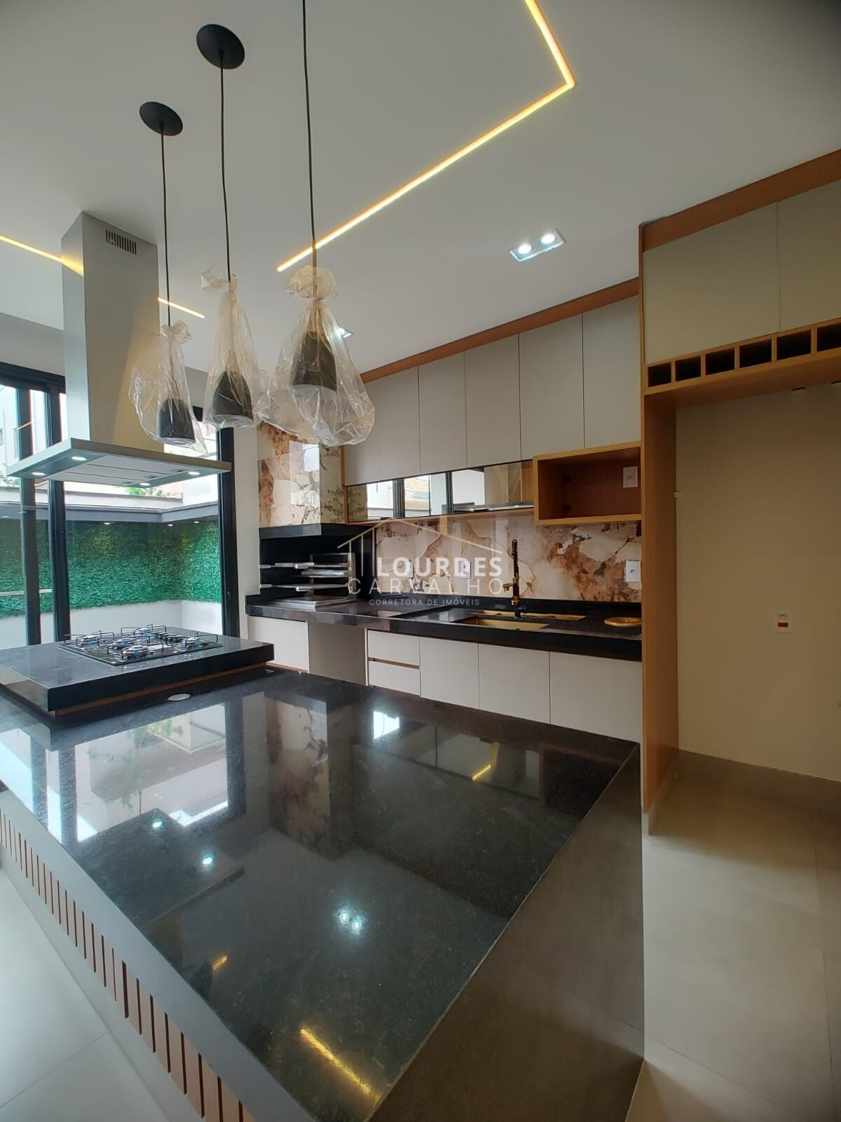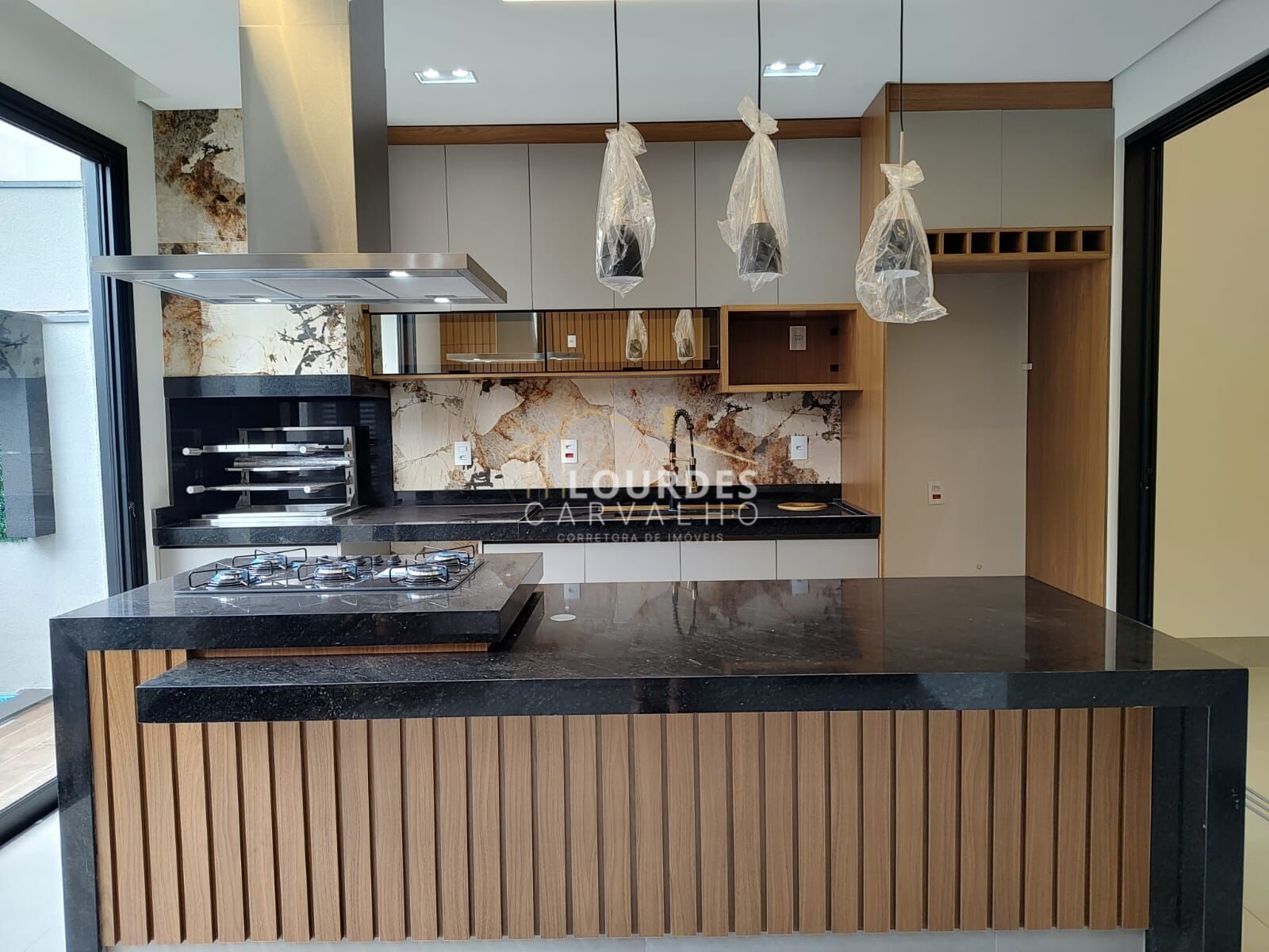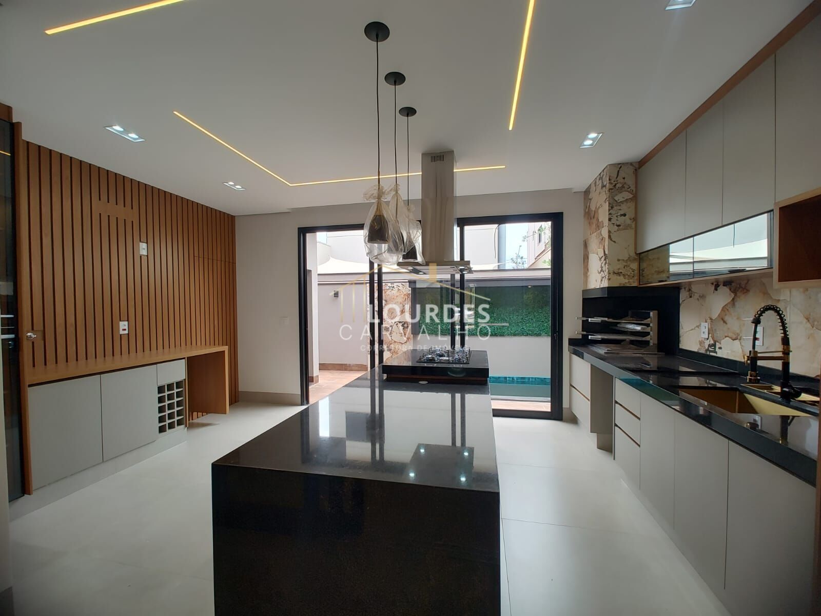 -Cozinha gourmet, modernos armários planejados com acabamento acetinado e espelhado, contrastando com a madeira ripada nos detalhes, ilha com bancada de apoio e equipada com cooktop e coifa em inox, adega na marcenaria, iluminação completa com canaleta Led e luminárias pendentes, bancada de apoio para churrasqueira, pia com lixeira embutida, escorredor louça e torneira gourmet com acabamento em cobre, contrastando com acabamento do revestimento da churrasqueira e da pia, preparação para chopeira para desfrutar momentos com a família e amigos, integrado a área de lazer;