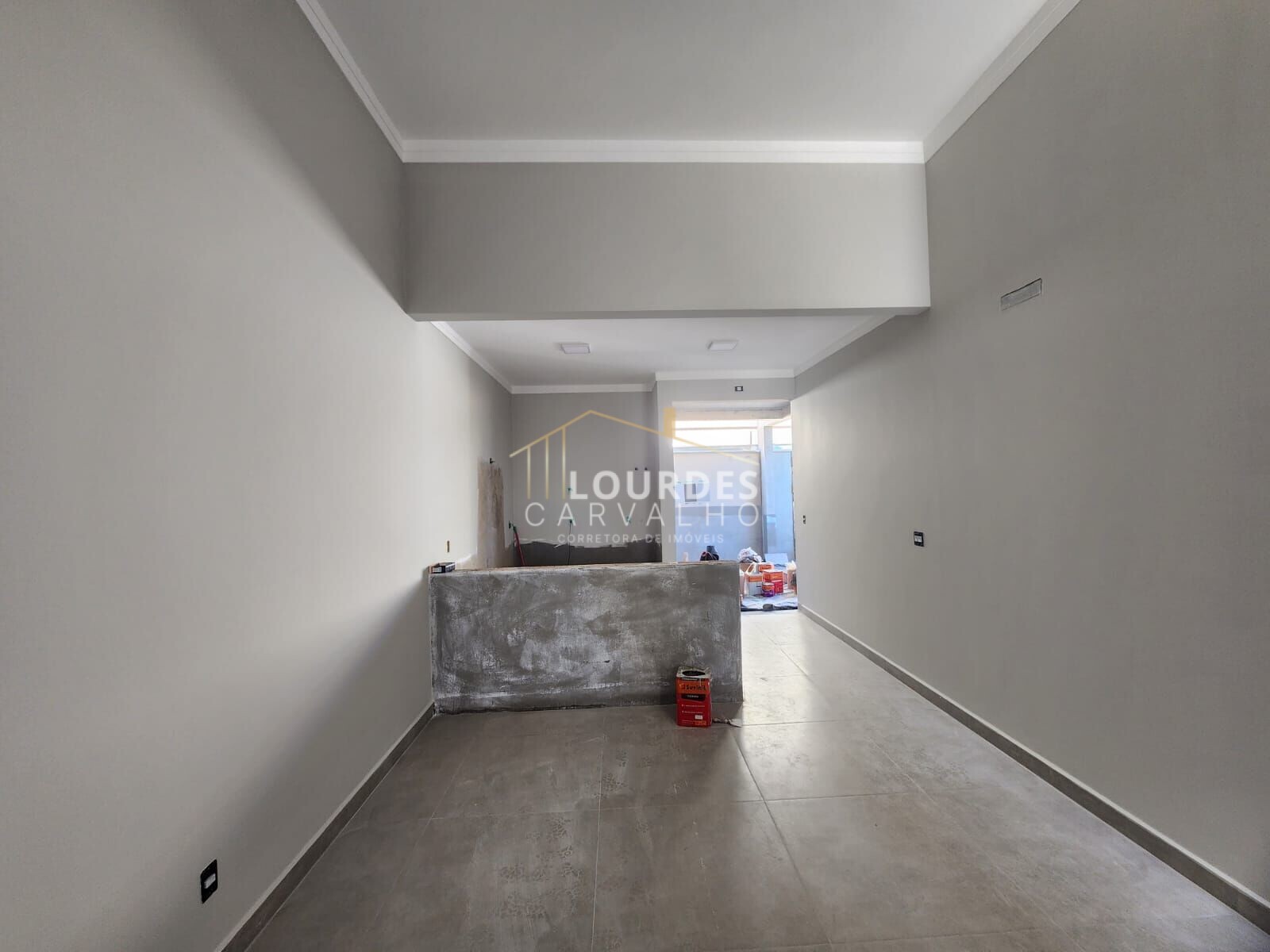 Sala ampla, lavabo, escritório, cozinha americana, área de serviço.