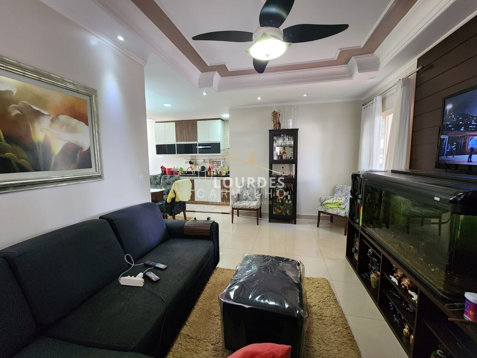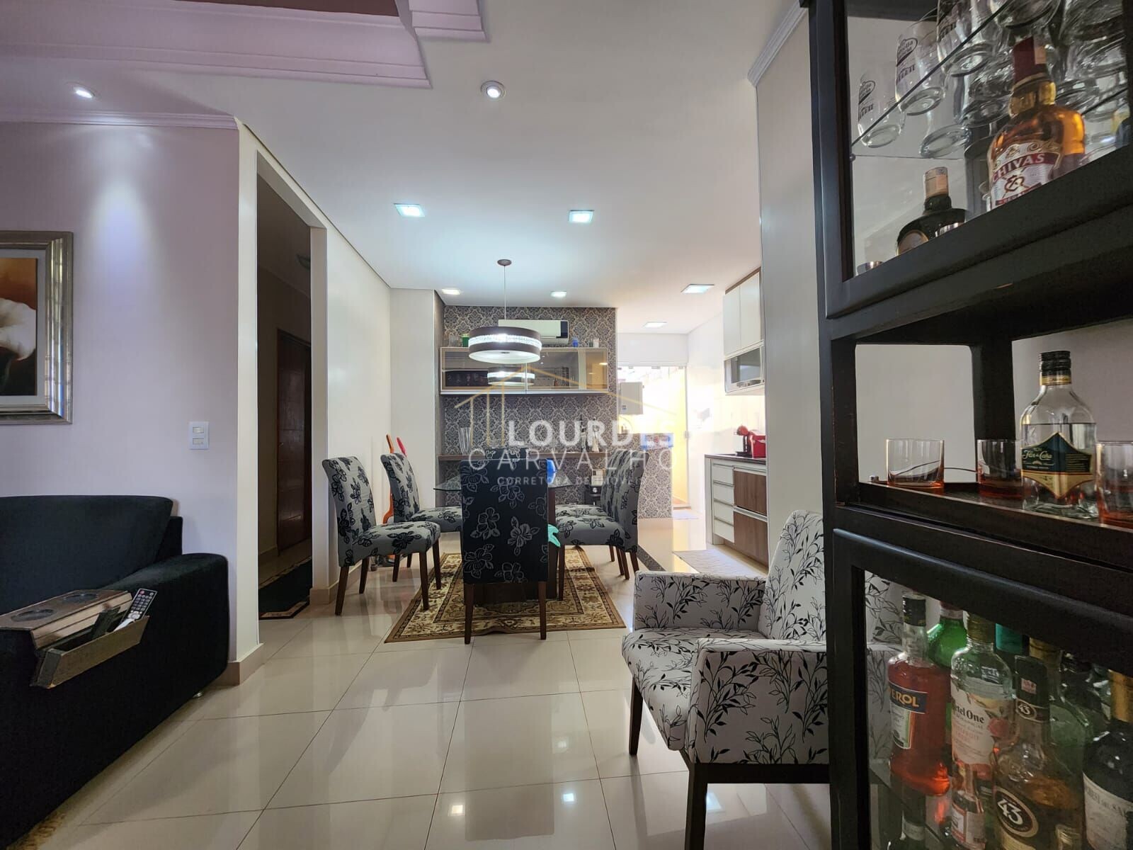Sala de TV, sala de jantar, cozinha e área de serviço.