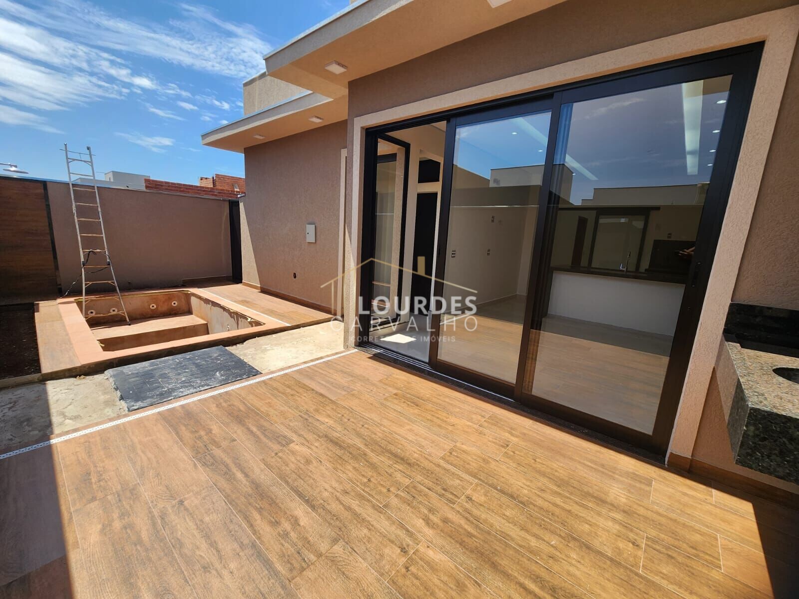 Quintal, piscina e banheiro externo.