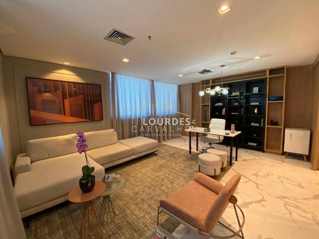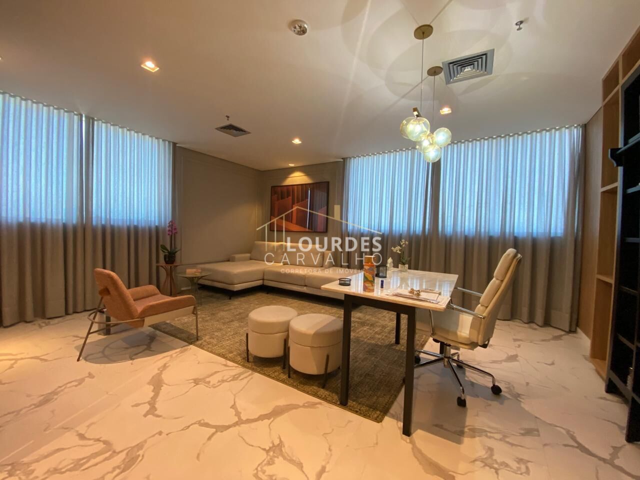 Sala comercial com formato de espera e escritório, mobiliada e equipada com extremo bom gosto e elegância, acabamento em piso porcelanato, revestimento copa e banheiro, iluminação, marcenaria e metais, assim como objetos de decoração de alto padrão, sala de esquina e cobertura e seguramente a melhor e mais bonita sala do andar, vista plena e permanente de frente para a Praça dos Palhaços;